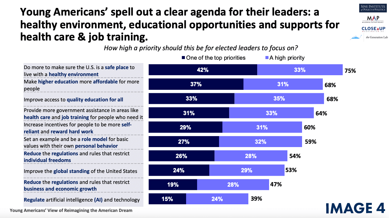 Finally, the findings of this youth civic engagement survey show that young people have a clear agenda for political leaders. Topping the list of priorities is ensuring a healthy environment, offering quality education for all, and making higher education more affordable.